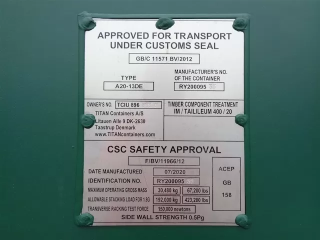 Công ước yêu cầu rằng bất kỳ container nào được sử dụng cho vận chuyển quốc tế đều phải gắn một tấm chứng nhận an toàn hợp lệ (CSC Plate). Tấm CSC được gắn vào mỗi container tại thời điểm sản xuất, thường là bên ngoài cánh cửa bên trái của container. Mỗi tấm CSC phải chứa một số thông tin cụ thể, với dòng chữ “CSC SAFETY APPROVAL” nổi bật trên tấm, cùng với quốc gia phê duyệt và số tham chiếu phê duyệt.