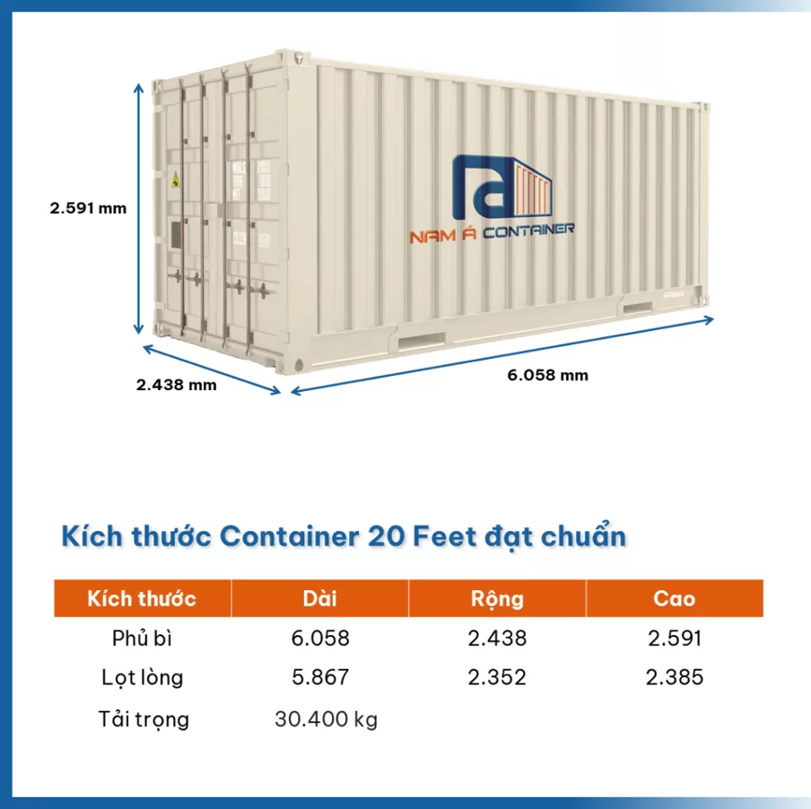 Đây là kích thước tối đa cho phép đối với một container 20 feet. Tuy nhiên, trên thực tế, kích thước thực tế của container có thể chênh lệch một chút so với tiêu chuẩn, thường là do các nhà sản xuất khác nhau.